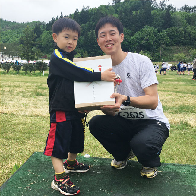 置賜で暮らすことについて以前からランニングが趣味で、たまに各地のマラソン大会にも出場しています。今年は初めて子供と2人で飯豊町の白川ダム湖畔マラソン大会に出場し、無事に2㎞を完走しました。置賜は自然豊かな環境で、子育てにおいても良い環境だと思います。最近は子供が虫採りに夢中で、週末は近くの山にクワガタやトンボを採りに行っています。